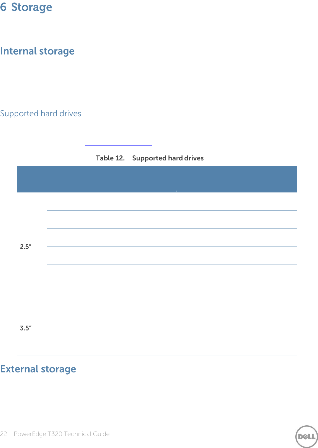 External storage for the T320 is available through SAS 6Gbps. For more information, see