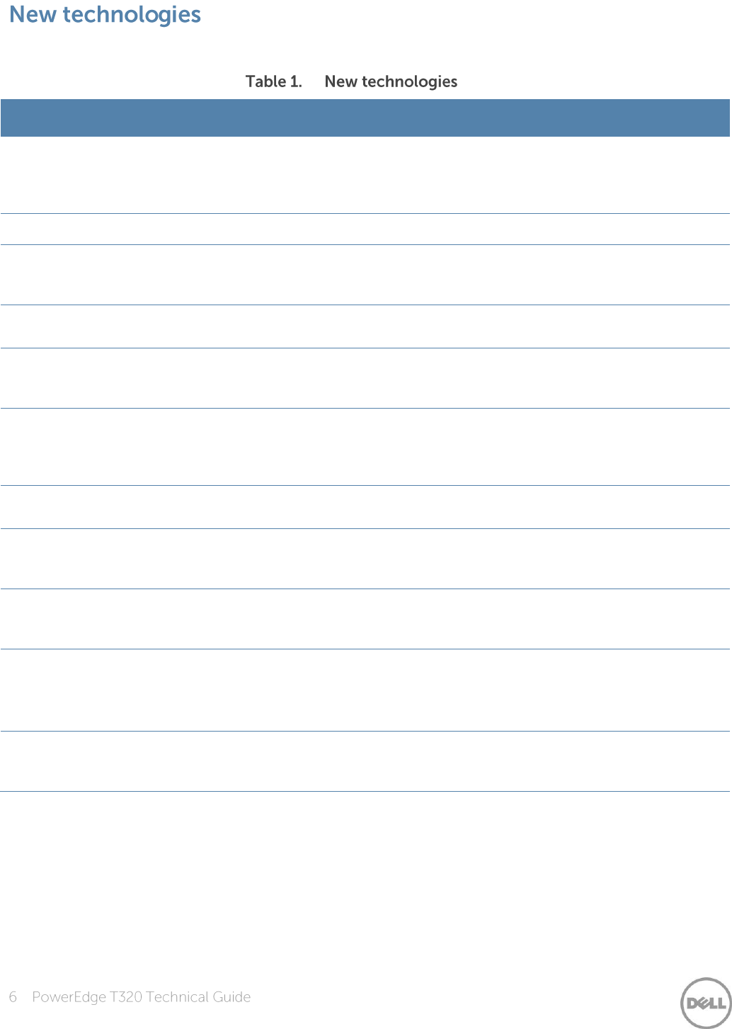Table 1 summarizes the newest technologies used in the Dell PowerEdge T320 tower server.