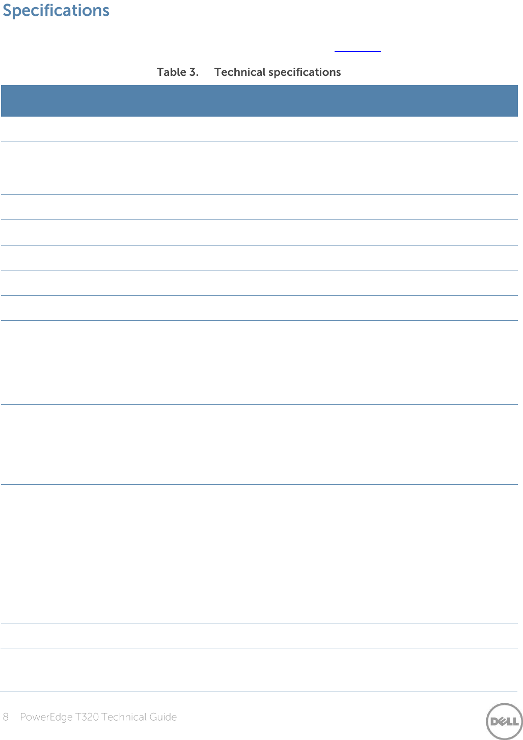 Table 3 summarizes the specifications for each of the PowerEdge T320 features. For the latest